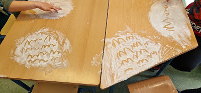 En esta ocasión la aprovechamos para practicar la letra "m". Me ha sorprendido bastante que para ser la primera vez que la practican, lo bien que la hacen. Aquí podéis ver imágenes de ello.